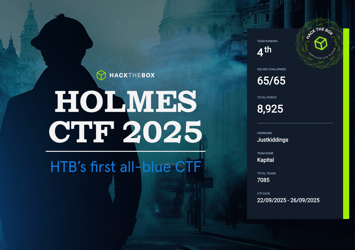 This challenge was part of the HTB Holmes CTF 2025 which was the first one of it’s kind. Being only about blue teaming and not the usual mostly red teaming CTF with the challenge of trying to exploit some vulnerabilities and trying to gain access to various systems. Instead this CTF covered Threat Intelligence, SOC, DFIR and malware reversing which are not usually seen in typical CTFs.