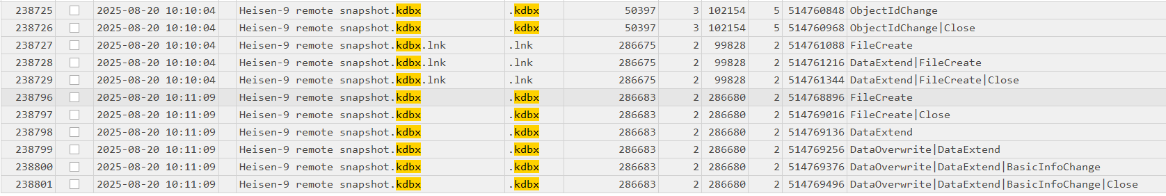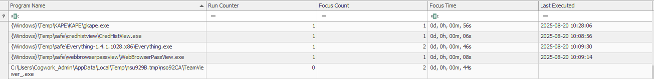 C:\Windows\Temp\safe\using TeamViewer (mimikatz.exe,Everything,JM.exe, browser credential stealers) (TeamViewer log)Potential OS Credential Dumping (20.08.2025, 10:07:08) - Attacker executed Mimikatz (USNJournal)