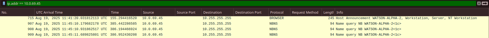 We can obtain this by filtering for ip.addr == 10.0.69.45 in Wireshark.