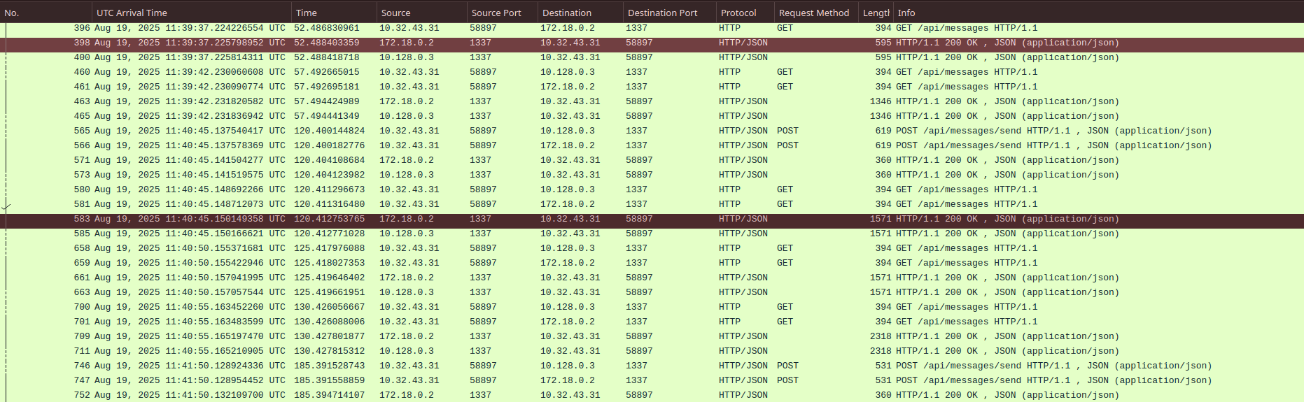 Upon filtering we can see that we are receiving JSON from the AI and specifically when doing a GET request on the /api/messages endpoint. On POST request the client sends users message as JSON to the AI. So on the GET requests it returns the whole conversation up till that point so we can easily see what the AI responded and what user sent to the AI.
