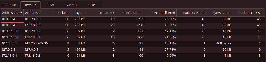 On closer investigation we can see that there are only 2 users (IP addresses) talking with the AI, 10.32.43.31 and 10.0.69.45. This we can easily find from the Wireshark under Statistics -> Conversations .